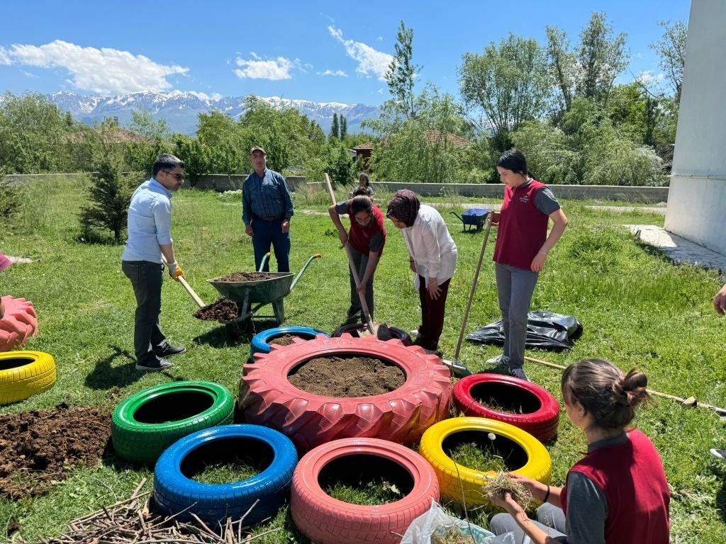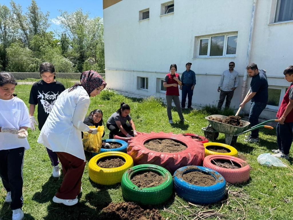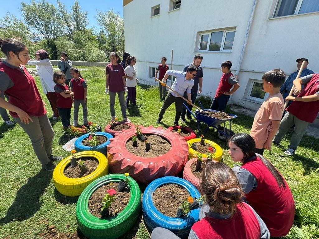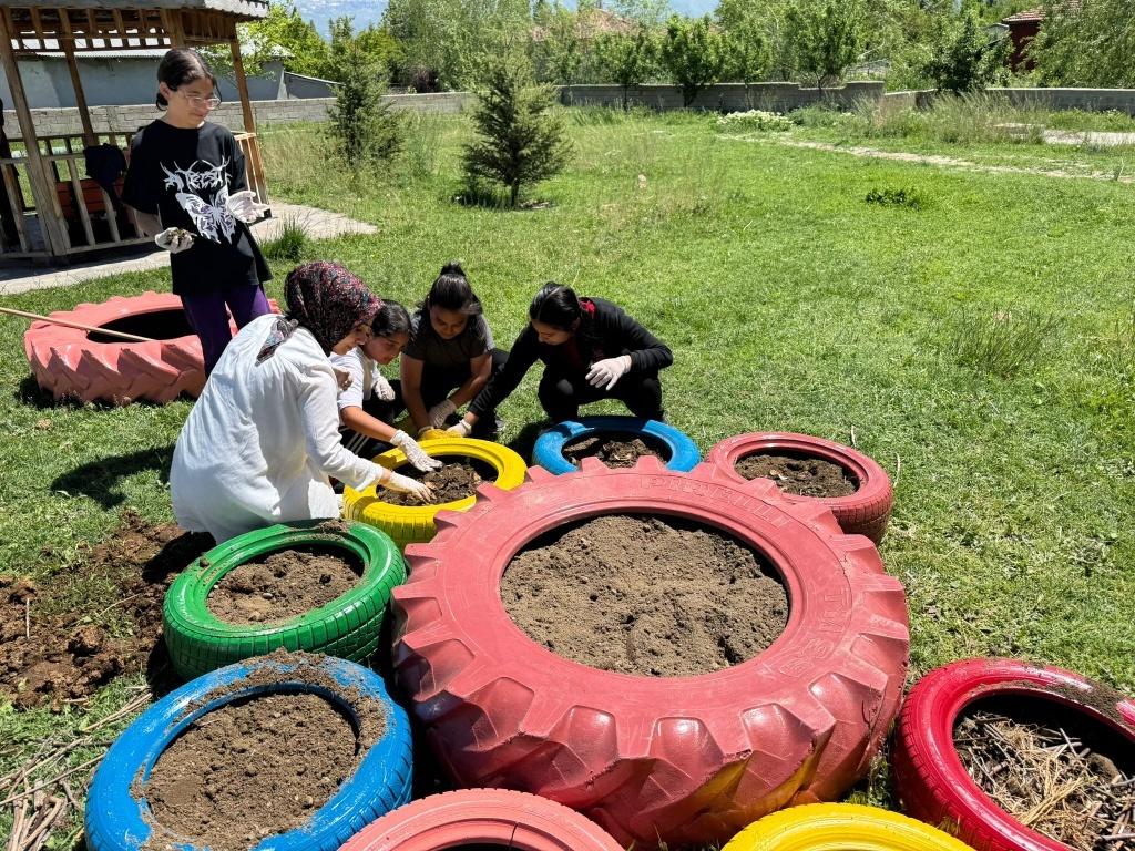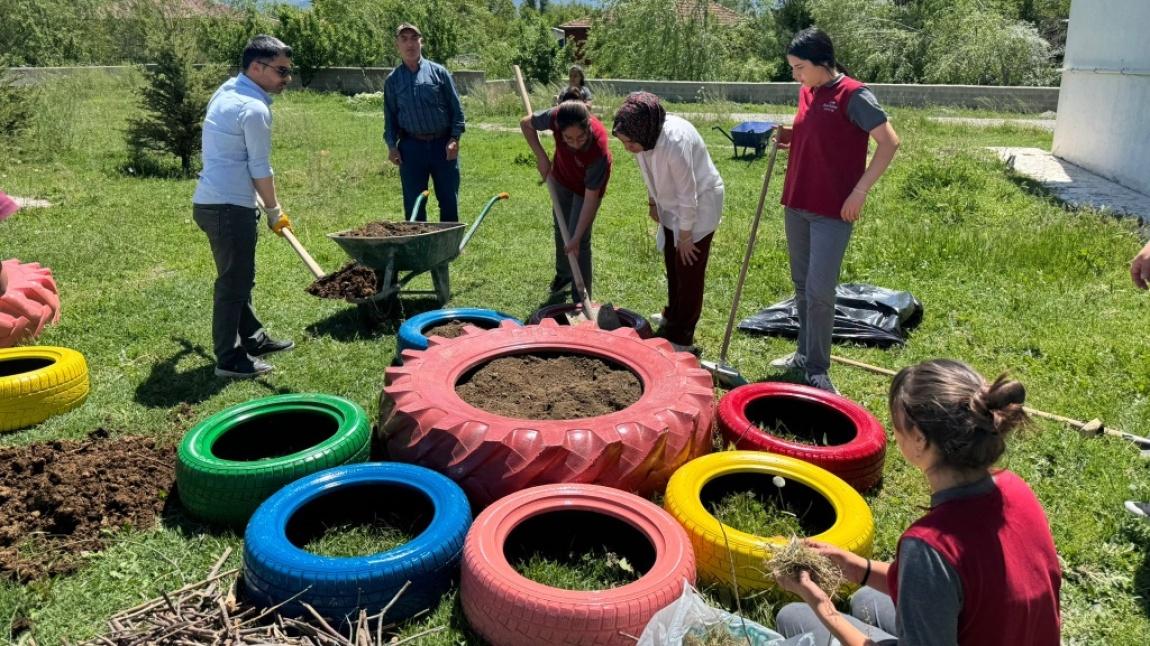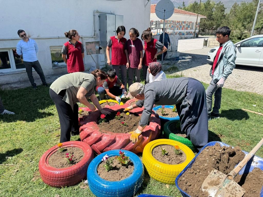 Kompostla desteklenen topraklara çiçek ve çiçek tohumu ekimi yapıldı. Atıl durumda olan lastikler renk renk cıvıl cıvıl bir görünüme kavuşturuldu. Çiçeklerin ekiminde, kompostun uygulanmasında görev alan öğrencilerimize bu çiçeklerin bakımıyla ilgili görev dağılımı da yapıldı.
