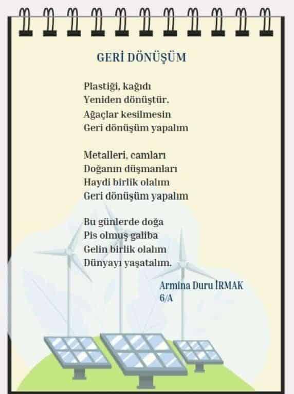 Enerji tasarrufu sağlamanın ve bunun bilincini öğrencilerde oluşturmanın bir uygulaması olarak okulumuz genelinde Enerji Tasarrufu temalı Şiir yarışması düzenledik. Yarışmamızı kazanan 7/A sınıfı öğrencisi Armina D. İrmak'ı tebrik ediyoruz.
