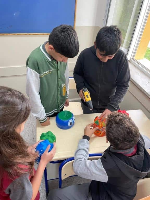 Okulumuz öğrencileri ile bir farkındalık çalışması daha gerçekleştirerek evdeki atık malzemelerden bir ileri dönüşüm etkinliği gerçekleştirdik. Hepimizin evinde olan, günlük hayatta bile neredeyse her gün elimize geçen plastik şişelerden hazırlanan, plastiğin saksıya çevrilmesi etkinliğini yaptık. Önce keserek şekil verdiğimiz plastikleri, akrilik boya ile boyayarak renklendirdik ve içerisine ektiğimiz çiçekleri toprakla buluşturduk.